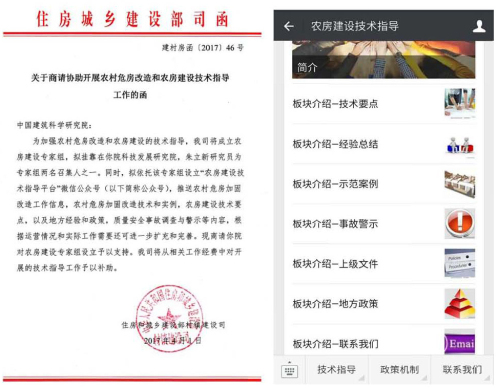 為配合專家組工作的開展,受住房和城鄉建設部村鎮建設司委托,依托專家組設立“農房建設技術指導”微信公眾號,致力于農房建設知識普及化、技術指導精準化,搭建上下互通,技術指導與示范建設協調并進的平臺。微信公眾號由住房和城鄉建設部村鎮建設司主導,我院科技發展研究院負責日常運營和管理,各地方村鎮建設管理部門和技術指導專家定期或不定期上傳相關信息,配合和支持公眾號的運營。